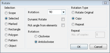 Mark the pattern(s) or element(s) to scale using the MARK sub-menu commands if the Auto Clear switch is on. (Patterns/elements can be marked at any time when the Auto Clear switch is off.) After pattern(s) or element(s) have been identified for manipulation, enter the point about which to mirror and the mirror angle. A negative angle is clockwise and a positive angle is anti-clockwise.