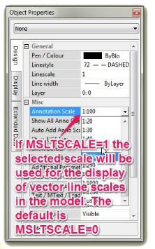 This setting is similar to the PSLTSCALE setting but is specific to the model. If the sheet uses the PSLTSCALE flag set to TRUE (Scale viewports is ticked) then setting this flag to TRUE allows the user to view how the linestyles will appear at various scales by selecting the model space annotation scale from the Object Properties dialogue (with no commands running). The default in Caddie is to set this flag to “False”. This is done to avoid confusion with the scales that are drawn. If it is used to check the display of linestyles at different scales it is recommended to set it false when returning to drawing. |