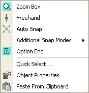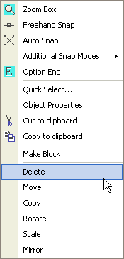Right clicking with the mouse (or Graphic pen equivalent) produces the context menu. The idea of this menu is to improve the speed of editing a drawing by providing the main editing tools as required. The term context means that depending on what you are doing will depend what options you are presented with.