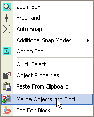 If a block is currently being edited the Merge Object into Block command is presented. If selected you will be then asked to indicate an object to merge. This is the same command as Merge Object Into A Block found in the Advanced Objects group of commands.