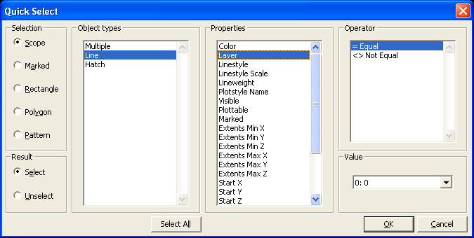 You can also make precise selections by the properties of object by using the context menu "Quick Select" command. This brings up the following dialogue box. The left side presents the selection result choices. Use it to choose the area of the drawing to be selected with the other settings. The results section allows you to either use the selection or negate the selection. In the object type section you will be presented with all the current objects in the drawing plus multiple for all of them. Here you can select one or more object types using a combination of control and shift keys with the left mouse button (or pen equivalent). Depending on what is selected in the "Object Types" selection window will depend on what properties are shown in the "Properties" window also this window will show a limited set of properties if more than one object type is selected.