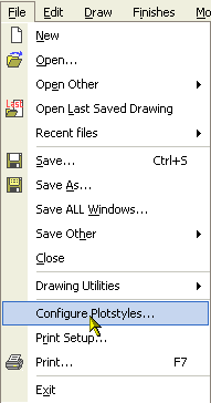 One important option in the sheet setup and model space is the 'Plot Style’ to be used when printing. It is a good idea to setup the various plot styles you will need in your environment BEFORE creating the required sheets for printing. This will typically be a one-off requirement. To configure the various plot styles, select the 'Configure Plot Styles’ from the file menu.