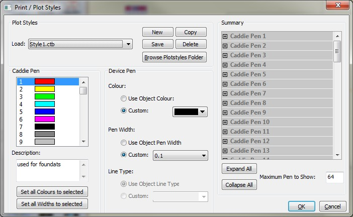 Create a new style. Every pen is set to object thickness and object colour. Create a new customised plot style. Caddie prompts you to enter a name for the new plot style