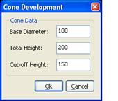 This command requires a new drawing. Enter the cone development values, the base diameter, total height and cut-off height.